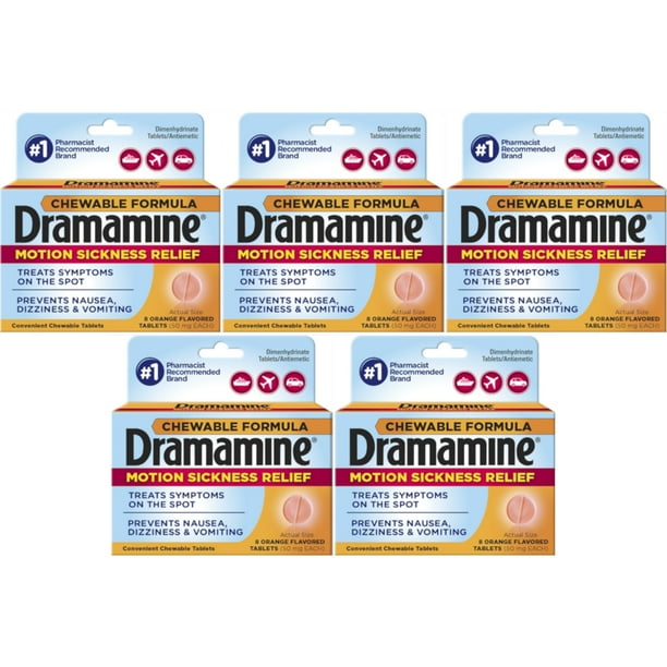 5 Pack Dramamine Motion Sickness Relief, Chewable Tablets Orange Flavor, 8 each